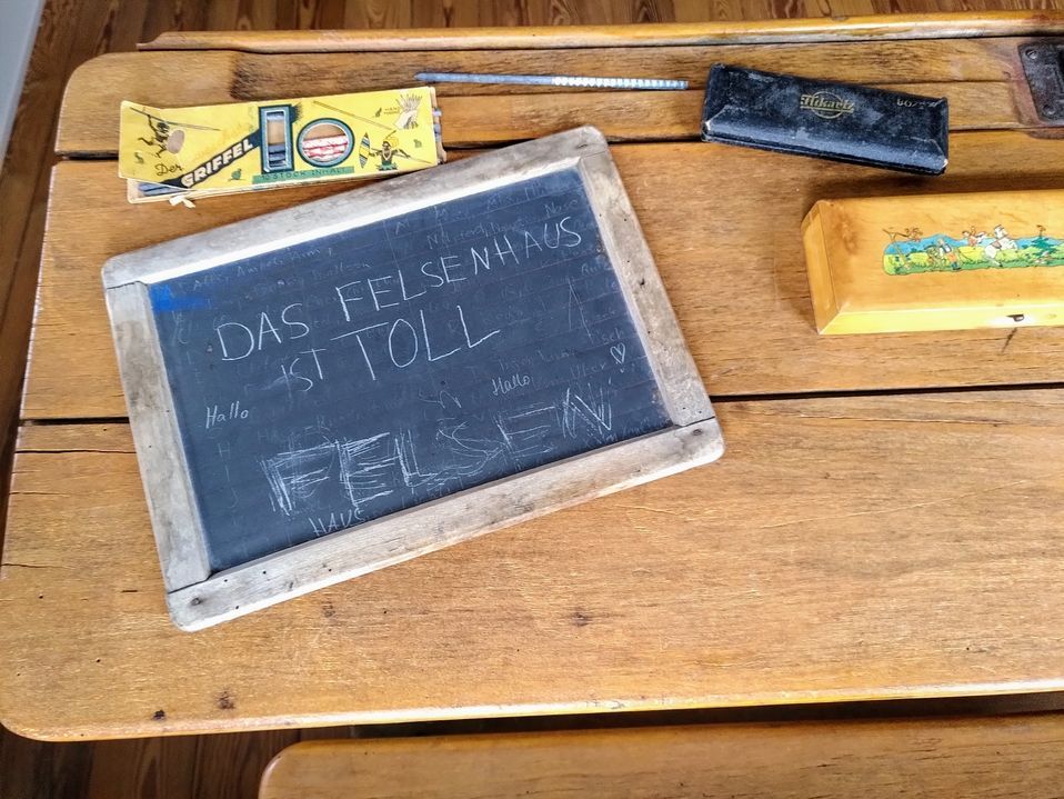 Umso mehr freut sich der Heimatverein, wenn, wie nach dem Tag der offenen Tür im Rahmen von „Kärwe meets Business“ geschehen, auf einer Tafel bei der historischen Schulbank diese im Bild festgehaltene, freiwillige Bewertung zurückbleibt. Zumal sie zeigt, dass das Felsenhaus mit seinem Ambiente und seiner Ausstellung auch bei seinen jüngeren Besuchern ankommt.