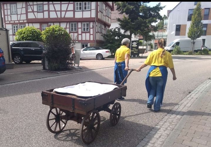 Quiche Lorraine und Zwiebelkuchen aus dem Steinofen, frisch zubereitet im Backhäusle von unserem bewährten Team unter Leitung von Gudrun Albrecht, im traditionellen Leiterwagen ofenfrisch zum Verkaufsstand am alten Rathaus transportiert.