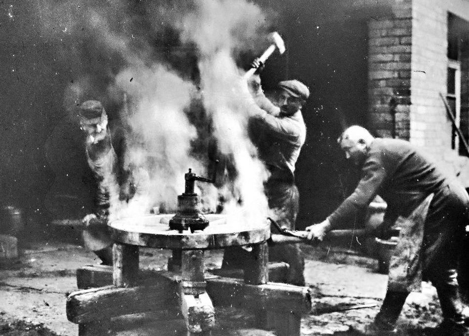 Der Fleiner Schmied Wilhelm Wüstholz mit seinen Handwerkergesellen beim Aufziehen eines Radreifens auf ein hölzernes Speichenrad (Aufnahme von 1930)
